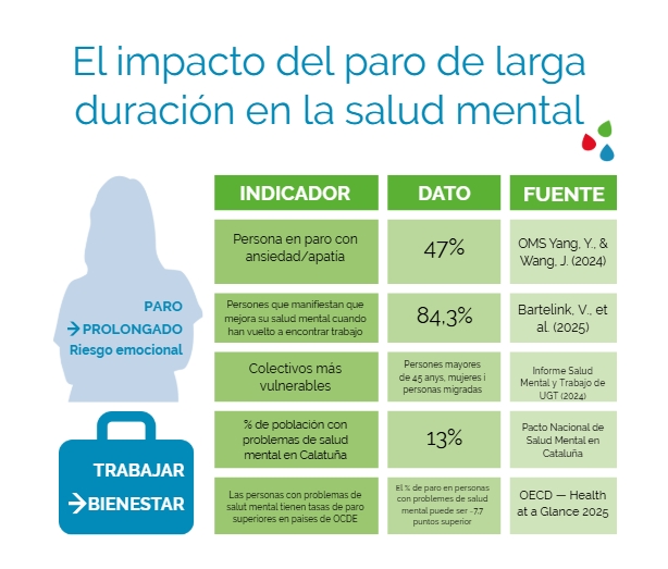 Al mismo tiempo, el Pacto Nacional de Salud Mental y Bienestar Emocional de Cataluña (2024–2030) alerta que el paro y la precariedad laboral son factores determinantes en el bienestar emocional de la población. Estas conclusiones refuerzan la idea que trabajo y salud mental están profundamente relacionadas.